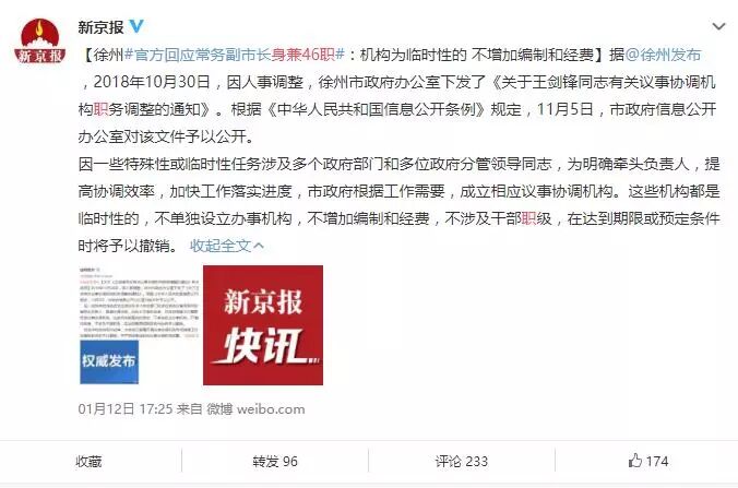 【徐州官方回应常务副市长身兼46职:机构为临时性的 不增加编制和经费】据@徐州发布,2018年10月30日,因人事调整,徐州市政府办公室下发了《关于王剑锋同志有关议事协调机构职务调整的通知》。根据《中华人民共和国信息公开条例》规定,11月5日,市政府信息公开办公室对该文件予以公开。
